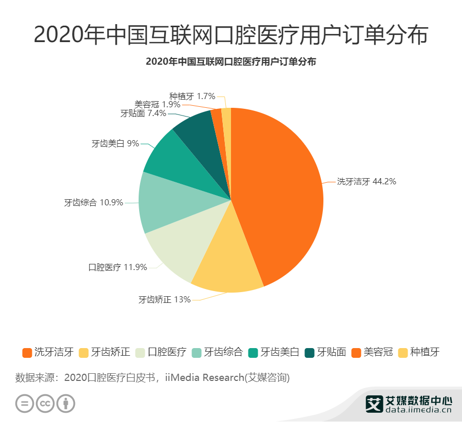 iiMedia Research(艾媒咨询)数据显示,2020年中国44.2%互联网口腔医疗用户订单为洗牙洁牙,13%则为牙齿矫正,11.9%属于口腔医疗订单。此外,互联网口腔医疗订单为牙齿综合、牙齿美白、牙贴面、美容冠以及种植牙的用户分别占比10.9%、9%、7.4%、1.9%和1.7%。