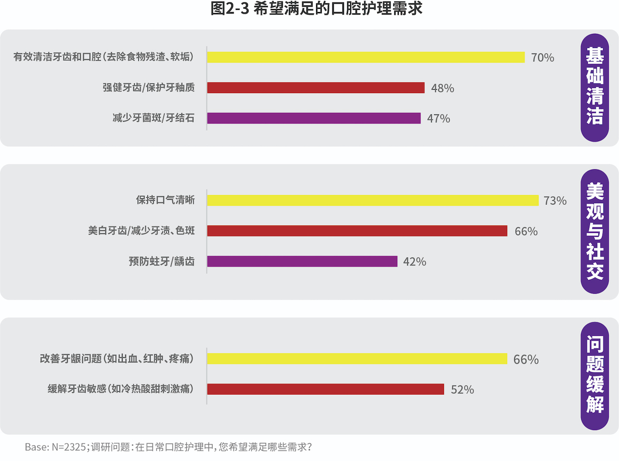 这种对根源的认知模糊,直接导致了口腔护理需求的本末倒置。消费者设定口腔护理目标更多是基于美观与社交的即时考量,保持口气清新和美白牙齿等表象需求高居前列,而直指问题核心的减少牙菌斑/牙结石这一根本性需求,占比却仅为47%。