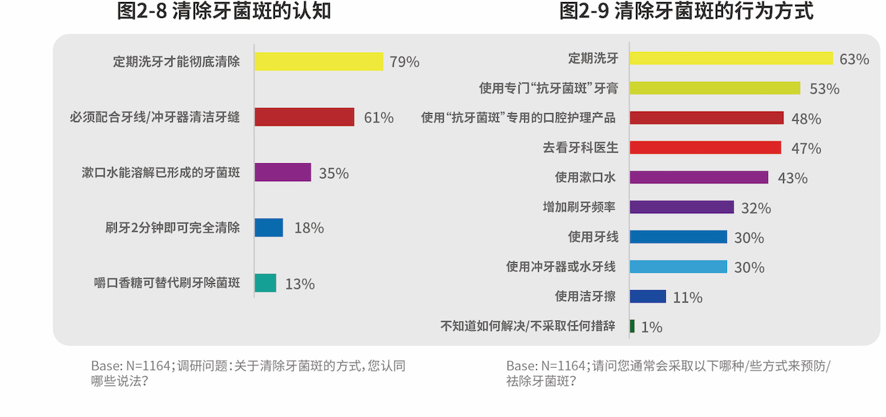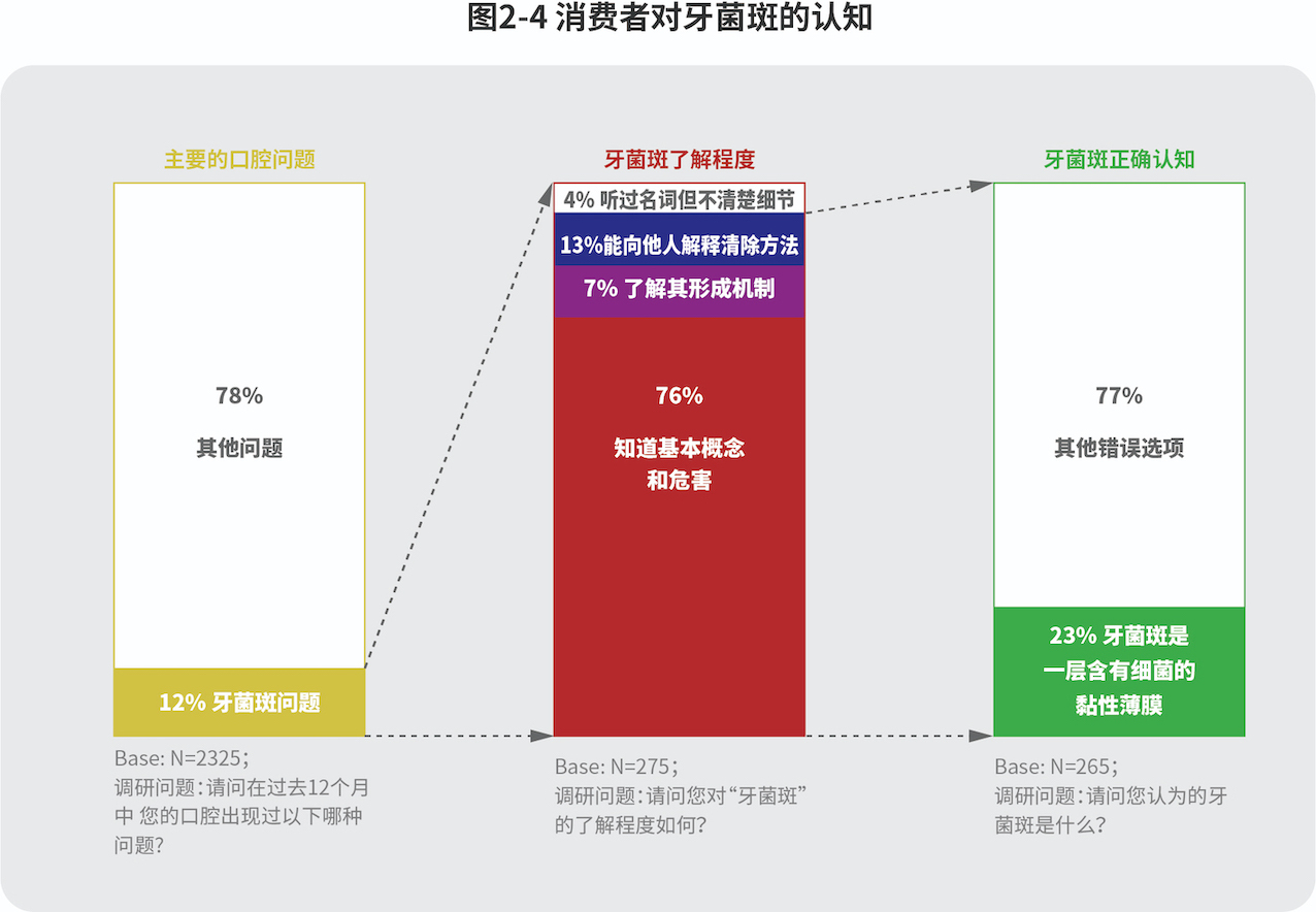 然而,消费者对这些问题背后的根本原因——牙菌斑的认知却严重不足。尽管76%的消费者自认为对牙菌斑有基本了解,但在认知测试中,仅有23%的人能够选出正确答案。