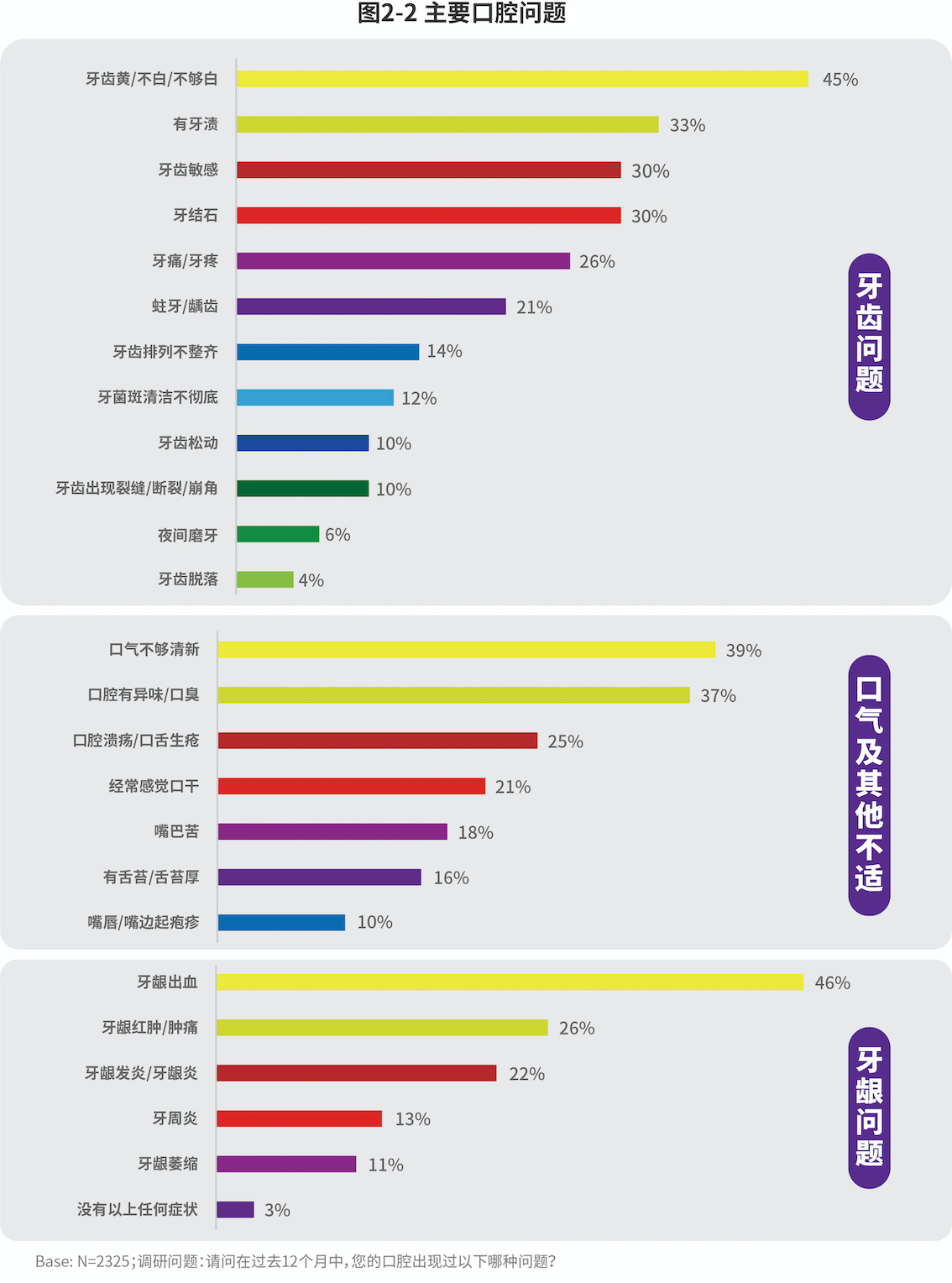 认知严重不足:牙菌斑的存在会增加全身疾病风险 仅21%消费者知晓 报告显示,我国消费者口腔健康自评普遍偏低,56%的消费者认为自身口腔健康状况处于“一般及以下”水平。牙龈出血、牙齿发黄、口气问题成为最突出的口腔问题。