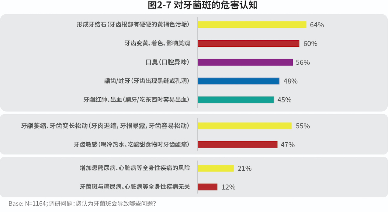 仅45%-64%的消费者认可其存在基础危害(如形成牙结石、牙齿变黄),约50%的消费者知晓牙菌斑有导致更严重的牙龈萎缩和牙齿敏感的风险,而了解牙菌斑的存在会增加糖尿病、心脏病等全身疾病风险的消费者,仅21%。