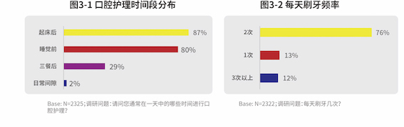 护理行为被动:仅39%消费者每半年进行一次口腔检查 报告精准揭示了当前消费者口腔护理行为存在明显的“三重三轻”现象。重早晚轻餐后:87%的消费者在起床后护理,80%的消费者在睡前护理,但仅29%的消费者会在三餐后护理口腔,餐后护理严重不足。