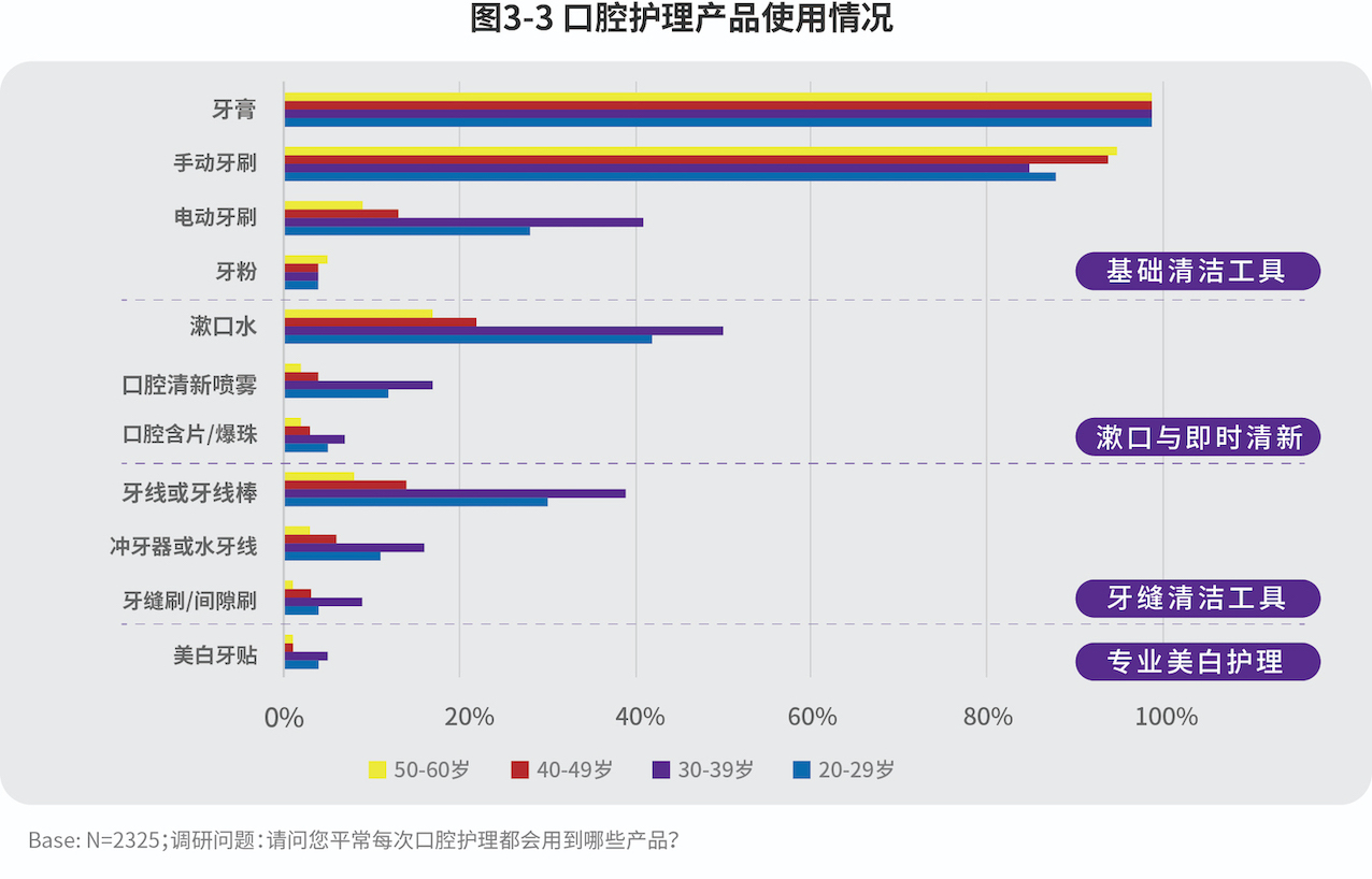 重基础轻进阶:76%的消费者每日刷牙两次,满足基础口腔清洁需求,基础清洁工具(如牙膏、牙刷)使用率高,但对牙线、冲牙器等能有效清洁牙菌斑的进阶清洁工具,采纳度普遍低下。