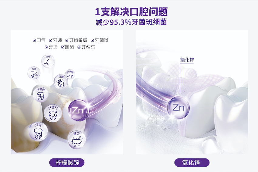 据悉,高露洁双锌减斑科技突破了单一活性成分的简单添加,使氧化锌与柠檬酸锌两种成分耦合并放大彼此功效,改善口腔微环境。刷牙时,柠檬酸锌扮演“突击队”角色,快速释放锌离子,瞬间穿透牙菌斑生物膜,实现即时清剿;氧化锌则如同“守护卫士”,它能在牙齿表面形成一层细微的保护膜,持续释放锌离子,干扰细菌粘附,实现12小时长效抗菌。