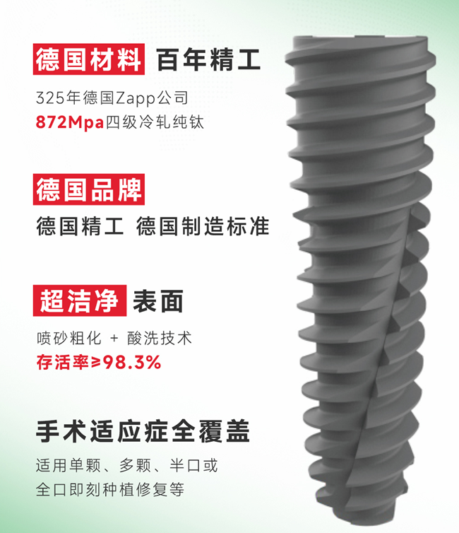 (二)德国新品种植体重磅发布:德系精工品质,为高性价比种植牙筑牢根基 本次盛典的重头戏,无疑是德国新品种植体发布。这也是上海顾嘉口腔为上海市民带来的核心诚意 —— 把纯正德系精工的高端种植体,以惠民首发价带到上海市民面前,彻底打破 “德系植体 = 高价” 的固有认知,让普通市民也能轻松享受到德国品质的种植服务。 德国制造在全球范围内,向来是严谨、精密、高品质的代名词,而此次发布的德国新品种植体,更是承袭了纯正的德系基因,从原材料甄选、生产加工到临床验证,每一个环节都遵循德国制造的严苛品控标准,各项性能均达到国际领先水平。 这款德国新品种植体的核心优势,每一点都精准切中了上海市民对种植牙的核心需求:其一,原材料采用德国 325 年 Zapp 公司生产的 872Mpa 四级冷轧纯钛,这是目前口腔种植领域的高端医用材料,具备极佳的生物相容性,不会与人体组织产生排异反应,能快速与牙槽骨实现骨结合,大幅缩短术后恢复周期;其二,采用喷砂粗化 + 酸洗的超洁净表面处理技术,能最大化提升植体与牙槽骨的接触面积,加快骨愈合速度,经大量临床数据验证,这款植体的长期存活率≥98.3%,只要做好术后口腔养护,使用寿命可达数十年;其三,手术适应症全覆盖,不管是单颗、多颗牙缺失的常规种植,还是半口、全口牙缺失的即刻种植修复,都能完美适配,哪怕是牙槽骨条件不佳的患者,也能通过这款植体实现稳定种植,适用人群极广。
